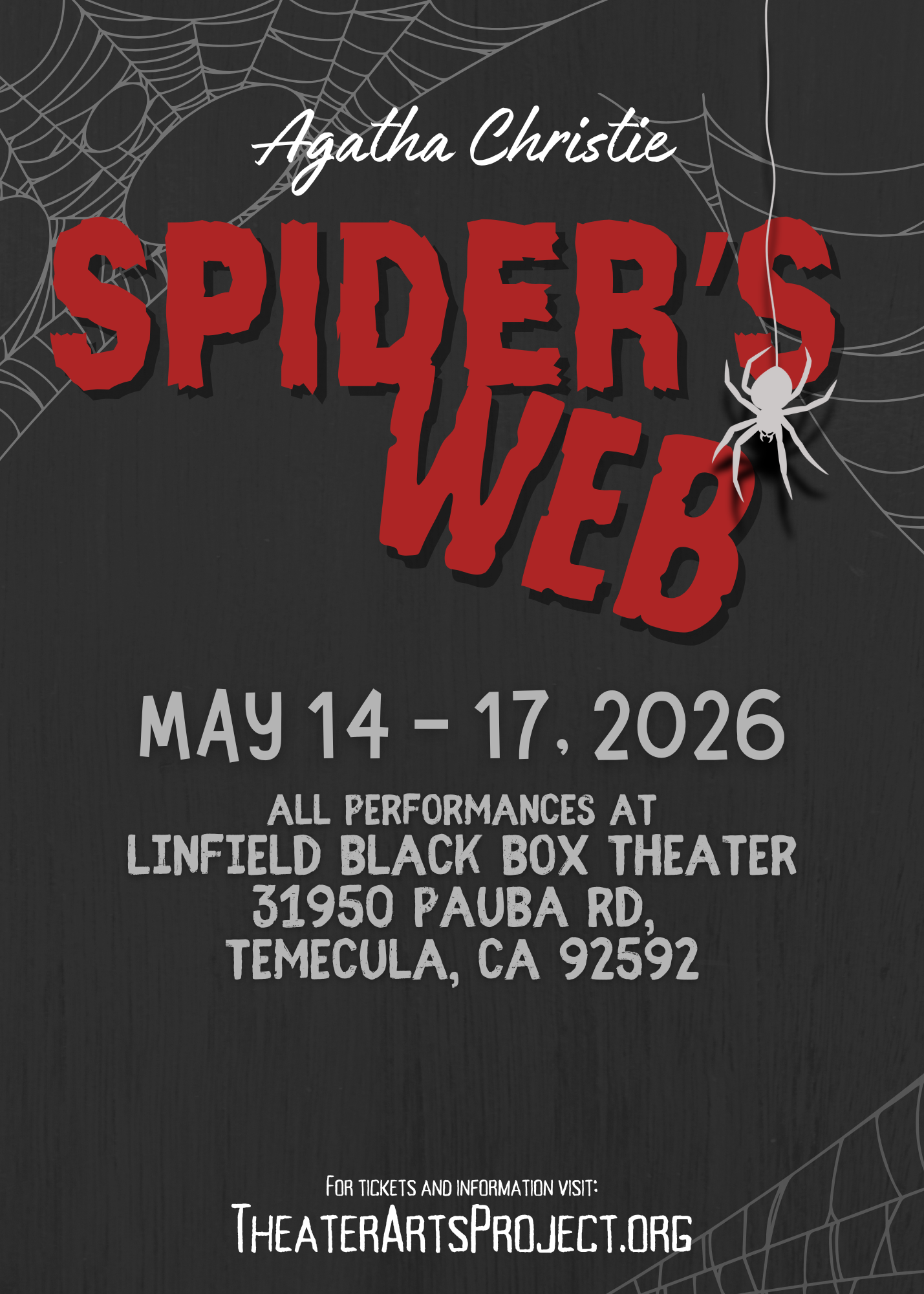 Spider’s Web, Agatha Christie’s clever and fast-paced mystery comedy! Set in an English country house full of secrets, the play follows the imaginative and quick-thinking Clarissa Hailsham-Brown, who unexpectedly finds herself dealing with a very real crime—and must rely on her creativity and confidence to stay one step ahead.